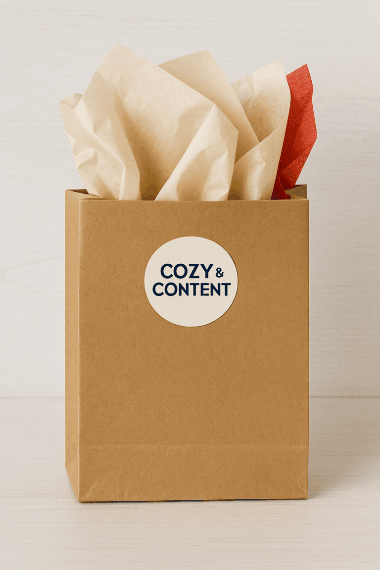 A sturdy kraft or decorative gift bag with tissue paper and a Cozy & Content sticker seal.