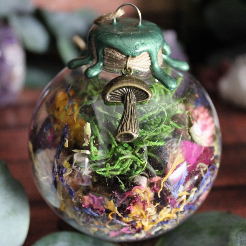 Our Forest Witch Ball is handcrafted and filled with a powerful blend of botanicals and crystal chips (see below), each chosen for their magickal properties of protection, abundance, grounding, love, peace, and joy. We also include a clear quartz point inside the ball to amplify the energy. It is adorned with a bronze mushroom charm, twine, green Spanish moss (inside the ball), and topped with green wax.