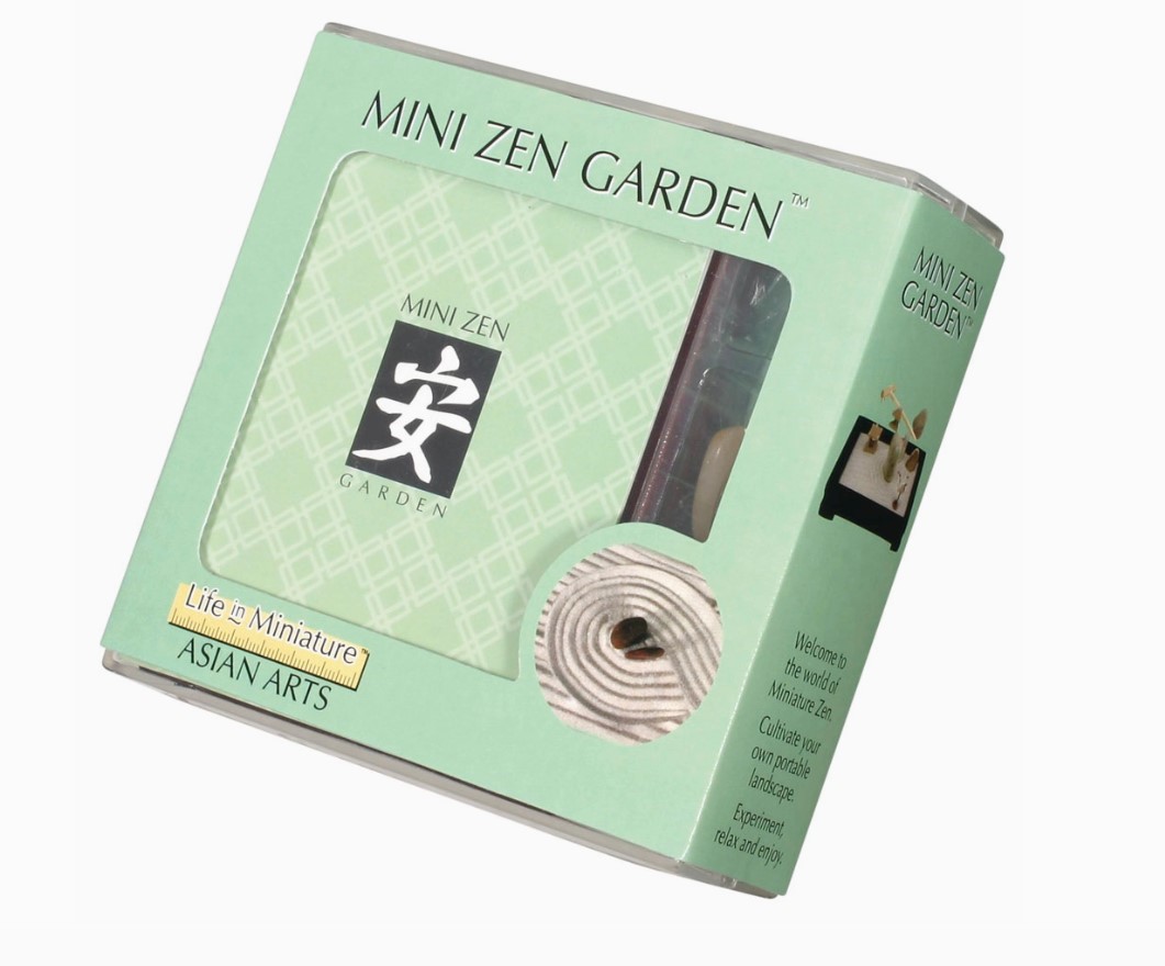 The Toysmith Mini Zen Garden features picturesque white sand within a handsome wooden box frame that looks elegant on a desk or coffee table. Box frame comes in either a black or rosewood finish. Each garden box kit also contains 3 colorful polished stones, 1 long-handled wooden rake, 1 mini ceramic crane figure, and 2 architectural figurines. This Mini Zen Garden kit comes in a mint-green box showcasing the Zen Garden desktop toy. A book of meditations offers suggestions for creating soothing garden shapes. Display case comes with assortment of both Mini Zen Garden styles.