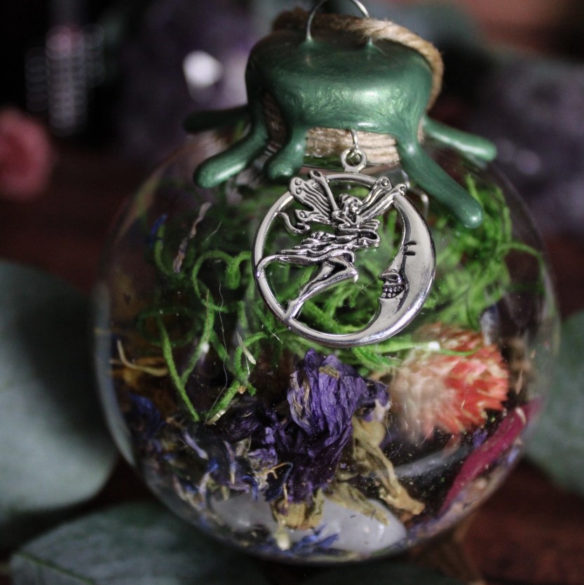 Our Moon Fairy Witch Ball is handcrafted and filled with a powerful blend of botanicals and crystal chips (see below), each chosen for their magickal properties of protection, abundance, grounding, love, peace, and joy. We also include a clear quartz point inside the ball to amplify the energy. It is adorned with a moon fairy charm (your choice of silver, or bronze), twine, green Spanish moss (inside the ball), and topped with green wax.