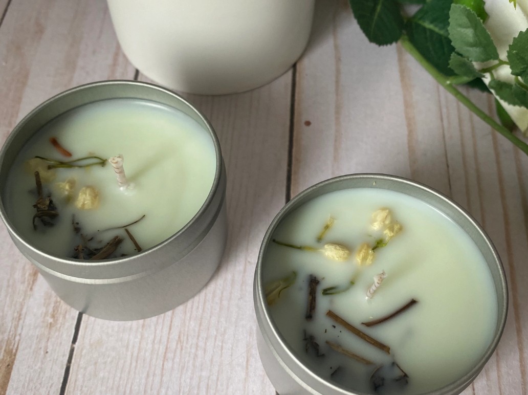 Manifest calmness and soothing feelings with this sage and eucalyptus soy candle. The top of the candle is decorated with dried sage and dried jasmine blossoms. Jasmine can represent love and sensuality and in some cultures, good luck and appreciation. Dried sage is used in smudging, divination and cleanings.